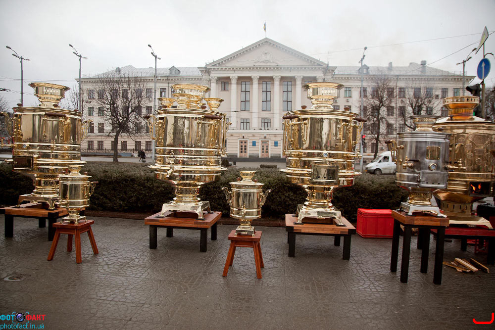 Девять огромных самоваров установили сегодня в центре Запорожья около часов влюбленных. Один такой самовар может с легкостью напоить до трех тысяч человек, а девять - более 30 тысяч. Заинтересовались самоварами и представители Книги рекордов Украины, которые приехали задокументировать новый рекорд.
