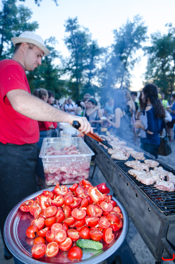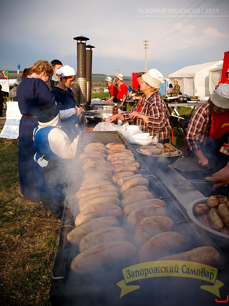 Запорожцам подавали шкварчанку на черном хлебе. Организаторы закупили тысячу буханок, каждая из которых была разрезана на 10 кусков.