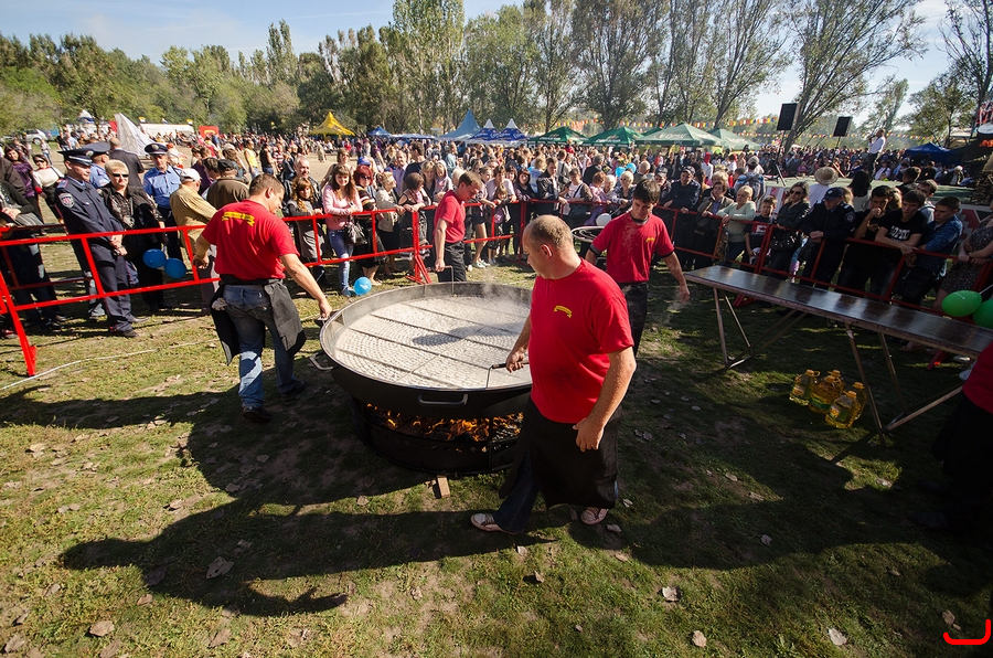 В Запорожье приготовили рекордную колбасу длиной 100 метров Колбасу готовили по старинному рецепту, без заморских специй и различных добавок. Ничего лишнего только мясо и чеснок с перцем. Повар трудился над рекордной колбасой двое суток.- Самое тяжелое было разделить ее на две тысячи порций, перевязывая веревочкой каждые 5 сантиметров колбасы. Продукты для блюда брал только домашние и готовил по бабушкиному рецепту, - отметил повар Игорь Крючков.Колбасу привезли в четырех больших кастрюлях, в каждой было по 25 метров. Для жарки подготовили огромную сковороду, диаметром два метра.Шесть человек скрутили колбасу в кольцо и уложили на специальную пластину. Сверху прикрутили шурупами крышку и в такой металлической упаковке отправили на сковороду. Конструкцию сделали специально под рекордное блюдо.На приготовление ушло около часа.