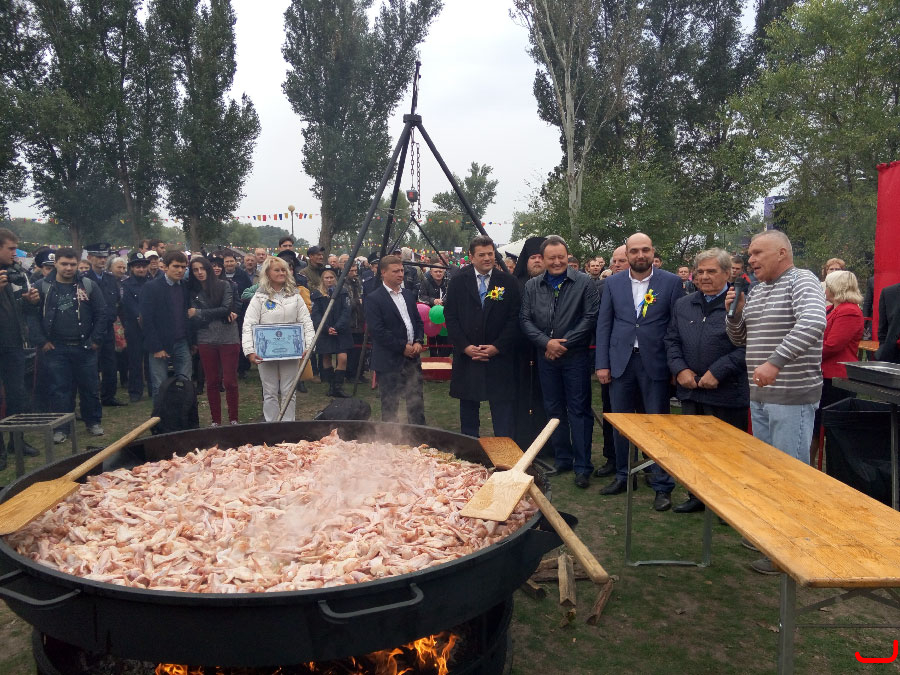 В субботу Запорожье отметило День рождения города многокилометровой Покровской ярмаркой на местной Набережной, а также установлением кулинарного рекорда Украины – приготовлением на сковороде-гиганте 250 кг куриных крылышек, ставших главным угощением для гостей праздника.